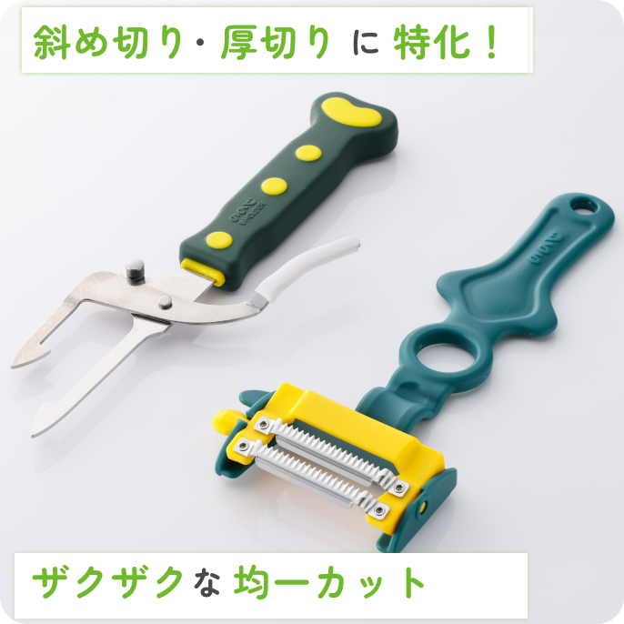 2枚刃だから包丁よりも速い!お好み焼きに使うキャベツの千切りや、うどんの薬味にねぎの斜め切りなど包丁で切ったかのようなカットをすることができます。