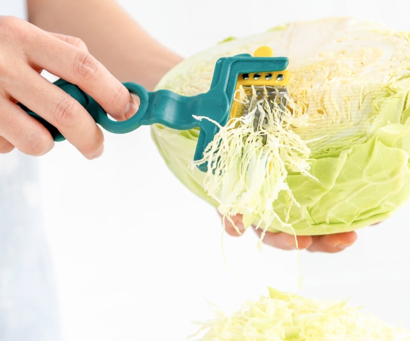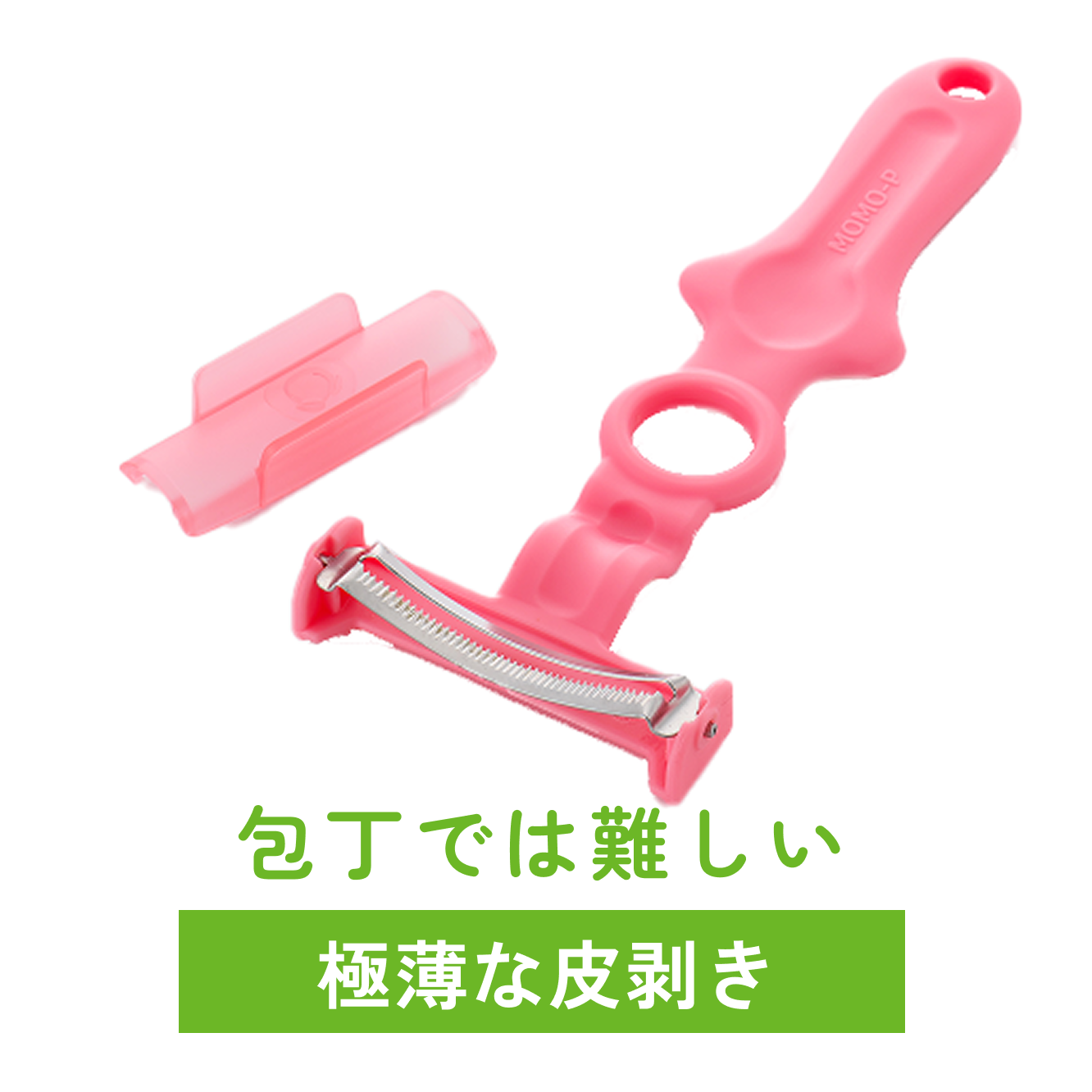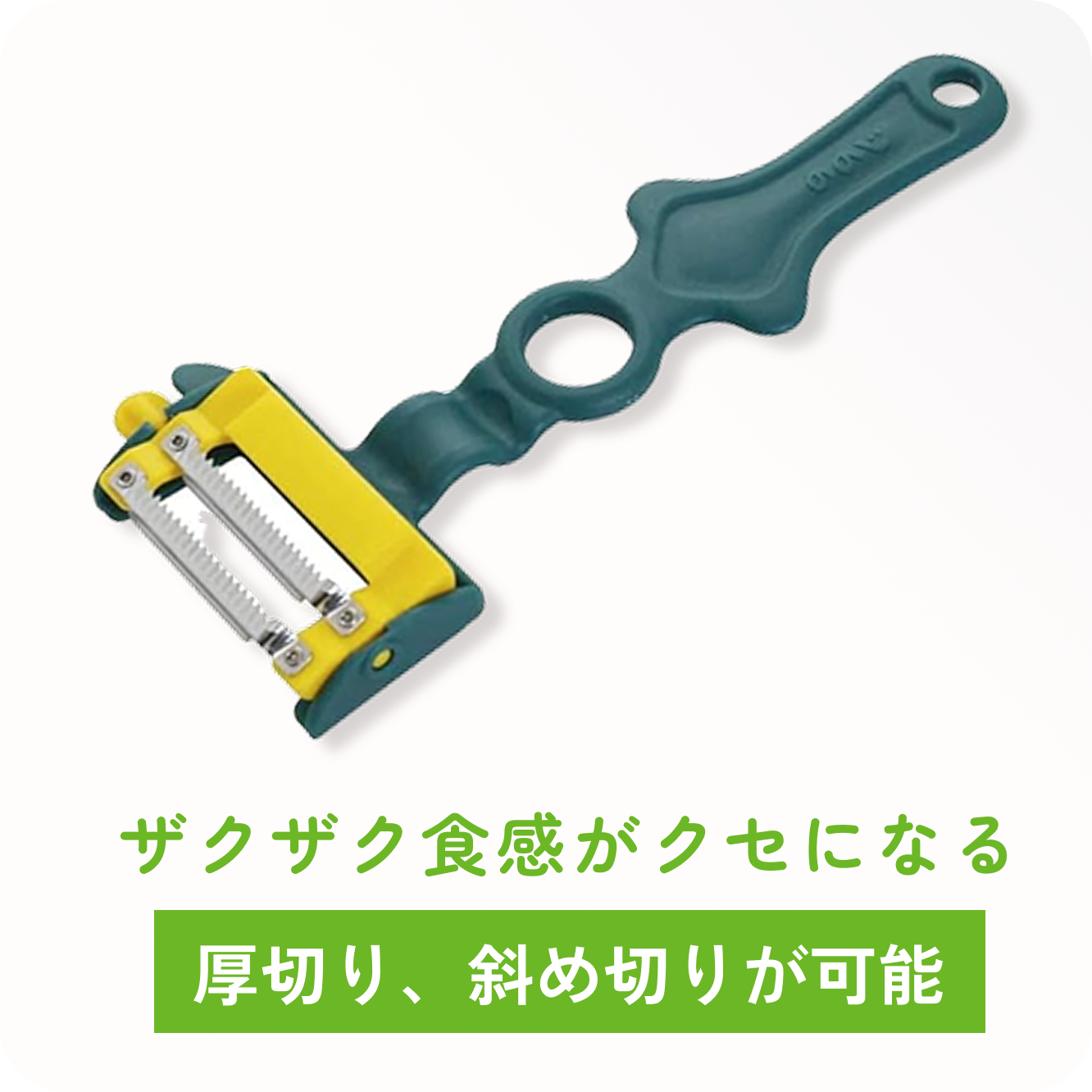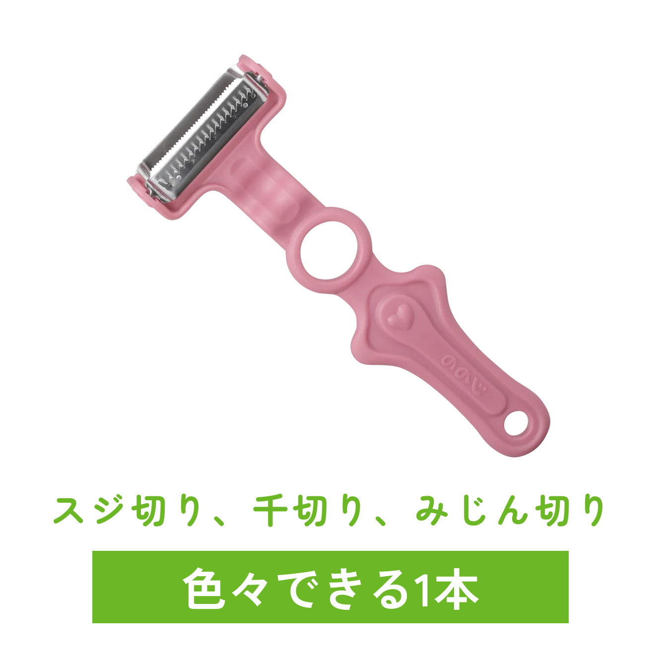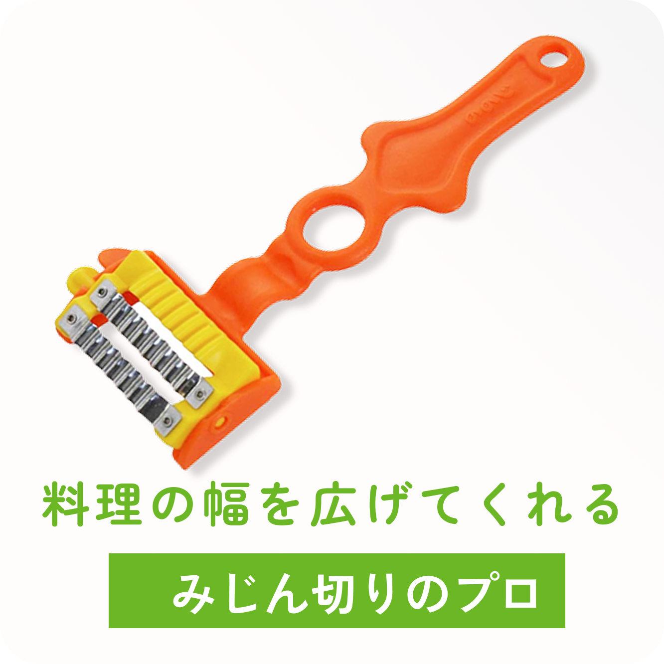 スムーズに皮剥きができるよう、持ちやすい「丸穴グリップ」を柄に設計。手にフィットする使い心地のため、少ない力で綺麗にキャベツの千切り、トマト、りんごなどの皮剥き、玉ねぎ、ニンジンのみじん切りなどができます。