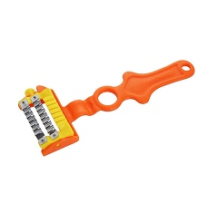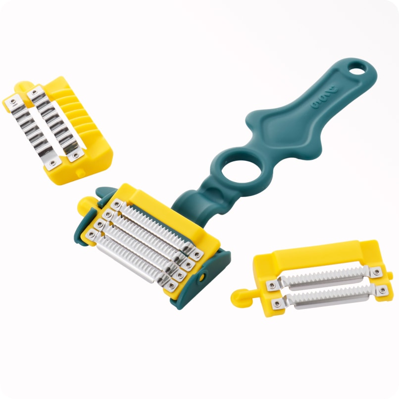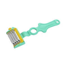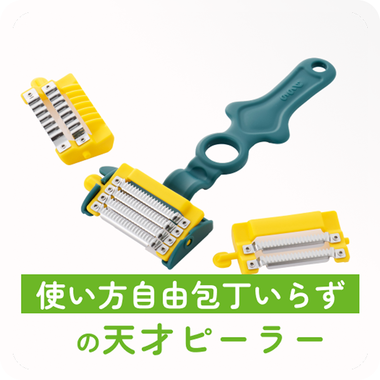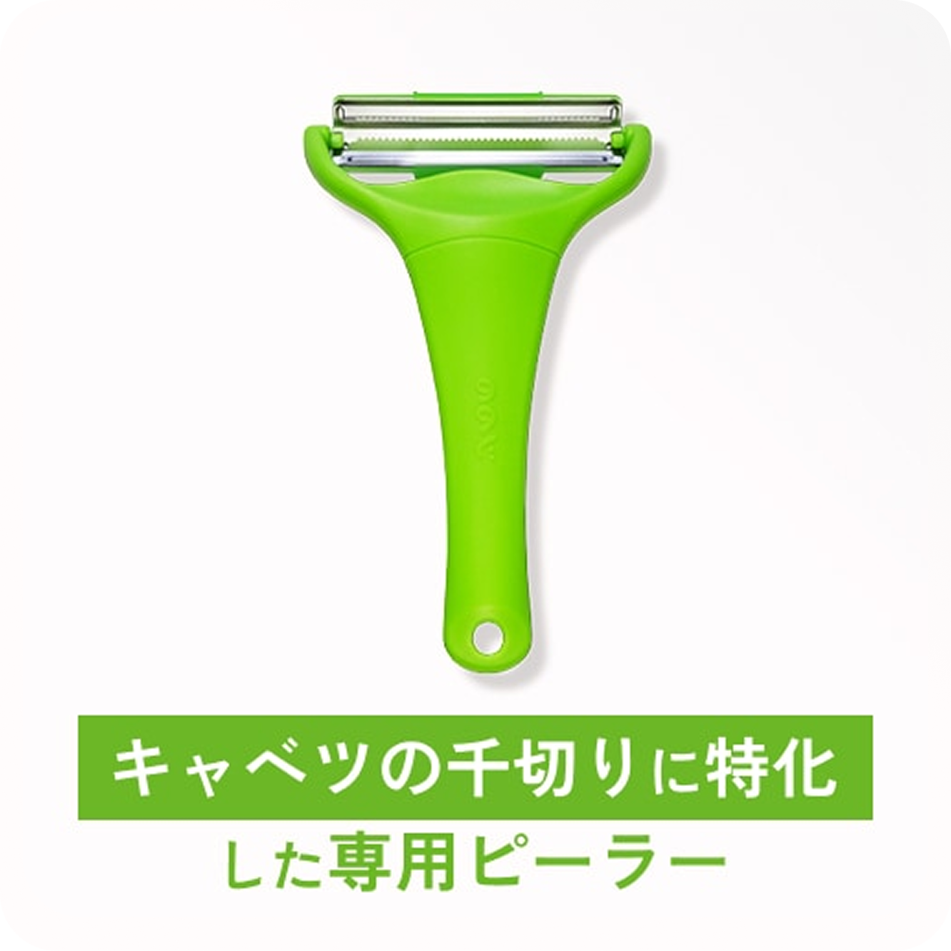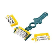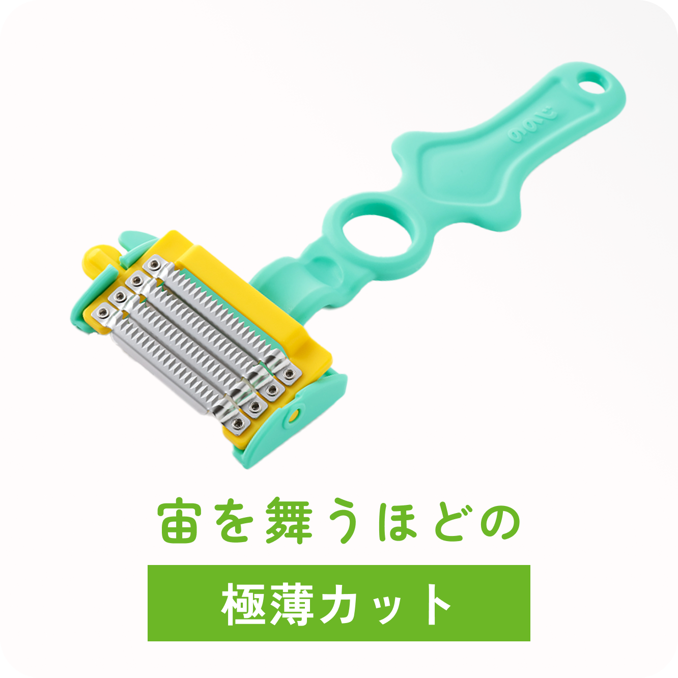 | 特徴 | 3種の交換刃で多彩なカット | 0.3mmの極薄4枚刃 | 簡単細千切り | 包丁では難しい均一カット | 軽い力でふわふわキャベツの千切り | 桃やりんごの丸状にフィット | 両面2枚刃でスジ切り |